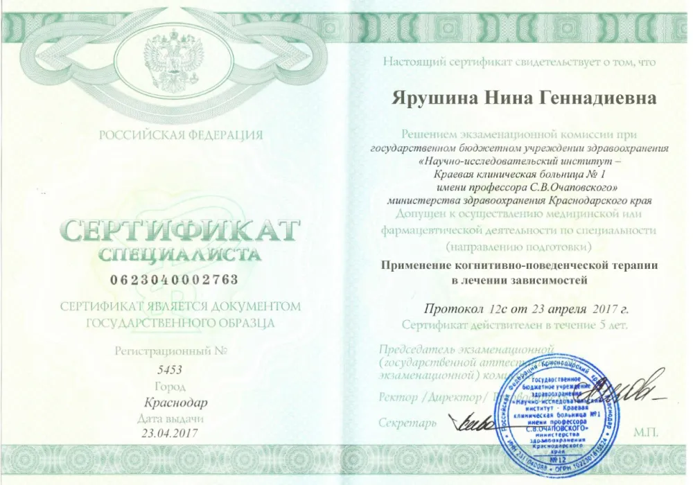 Ярушина Нина Геннадиевна — главврач, врач высшей категории, психиатр-нарколог с двадцатилетним опытом работы. Нина Геннадиевна обладает глубокими знаниями в области психиатрии и наркологии, предлагая эффективные методы борьбы с зависимостями. Она использует индивидуальный подход к каждому пациенту, что позволяет достигать высоких результатов в их исцелении.